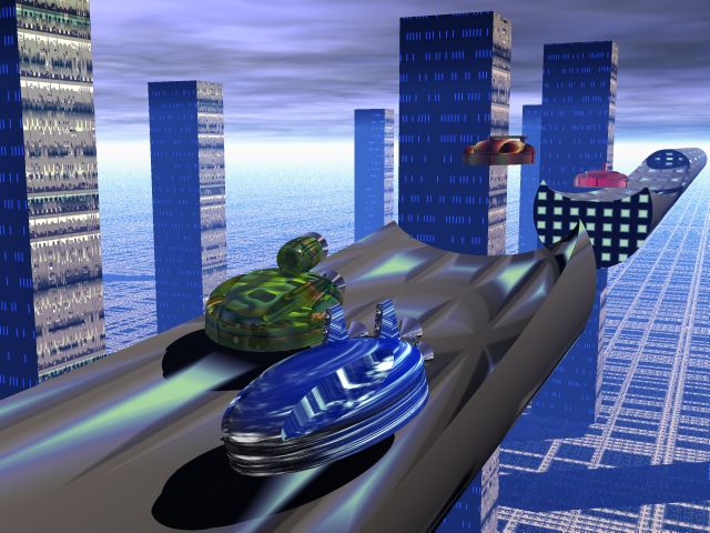 Description: Created: July 24, 2001. This was an early Bryce image I did based on the F-Zero video game. Just Bryce primitives, so it's not that impressive.