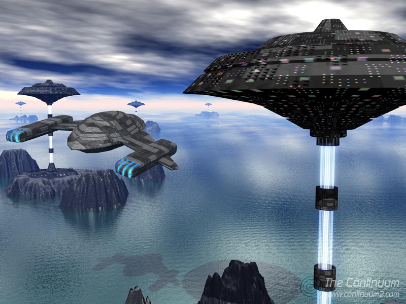 Description: Created: March 29, 2002. I liked this one a lot. Don't really remember where I came up with the idea, but it turned out well. This was probably one of my first projects using Blender as a modeller, so the objects are pretty simple and symmetrical. Still, a big step up from what I was doing before (Bryce Primitives). The mountains, water, etc. were done in Bryce. This is a slightly updated version. I added some glow to the engines and energy pillars.