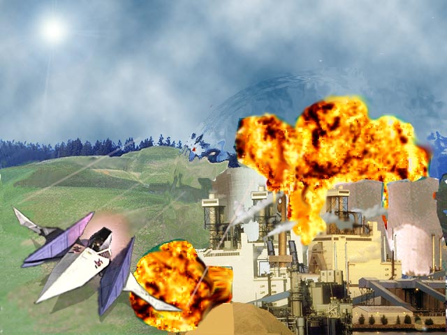 Description: Created: April 26, 1998. This is another of my very early works made from stock photos. This was inspired by the 'Macbeth' level in Starfox 64. Big explosion.