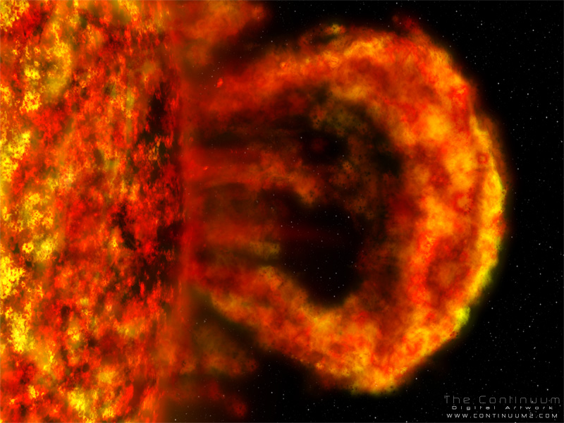 My attempt at a solar flare. I did one render in Bryce, but this is almost entirely Photoshop.