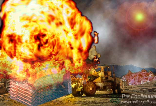 Description: Created: October 1, 1997. Inspired by the video game Blast Corps, where you go around blowing up buildings. This image is basically a bunch of Photoshopped stock art. Very early work.